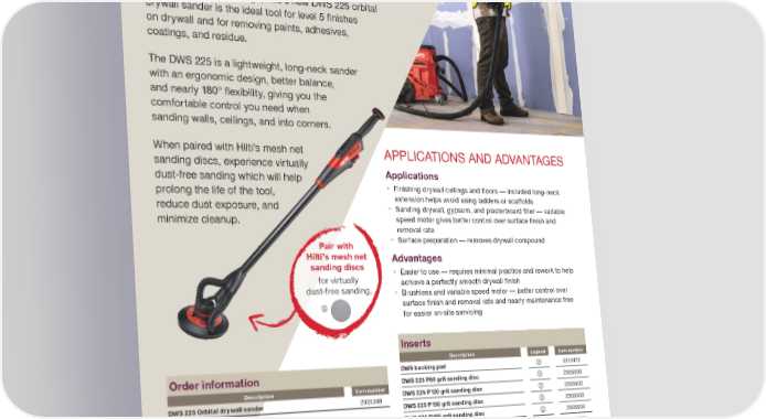 722/)/((7 0$1$*(0(17 Order information Description Item number DWS 225 Orbital drywall sander 2305388 Accessories Description Legend Item number DWS cable 120V 2314554 DWS 225 extension 50cm 2301717 DWS soft bag 2301716 VC 150-6XE Vacuum 372139 VC 150-10XE Vacuum 3721394 A NEARLY EFFORTLESS LEVEL 5 FINISH DWS 225 Orbital drywall sander With superior ergonomics, class-leading dust control, and a user friendly design, Hilti’s new DWS 225 orbital drywall sander is the ideal tool for level 5 finishes on drywall and for removing paints, adhesives, coatings, and residue. The DWS 225 is a lightweight, long-neck sander with an ergonomic design, better balance, and nearly 180° flexibility, giving you the comfortable control you need when sanding walls, ceilings, and into corners. When paired with Hilti’s mesh net sanding discs, experience virtually dust-free sanding which will help prolong the life of the tool, reduce dust exposure, and minimize cleanup. Inserts Description Legend Item number DWS backing pad 2312472 DWS 225 P80 grit sanding disc 2305500 DWS 225 P120 grit sanding disc 2305502 DWS 225 P150 grit sanding disc 2305503 DWS 225 P180 grit sanding disc 2305504 DWS 225 P240 grit sanding disc 2305506 DWS sanding disc interface pad 23174 5 0 we want to hear from you APPLICATIONS AND ADVANTAGES Applications • Finishing drywall ceilings and floors — included long-neck extension helps avoid using ladders or scaffolds • Sanding drywall, gypsum, and plasterboard filler — variable speed motor gives better control over surface finish and removal rate • Surface preparation — removes drywall compound Advantages • Easier to use — requires minimal practice and rework to help achieve a perfectly smooth drywall finish • Brushless and variable speed motor — better control over surface finish and removal rate and nearly maintenance free for easier on-site servicing Pair with Hilti’s mesh net sanding discs for virtually dust-free sanding.