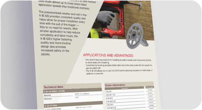 FASTER FASTENING TO COLD-FORMED STEEL X-IE-GS Insulation fasteners Built to make insulation fastening to metal studs easier, X-IE-GS insulation fasteners to cold-formed steel studs deliver up to three times faster application speeds than traditional methods. The preassembled washer and nail in the X-IE-GS provides consistent quality and helps allow for proper installation every time with the pull of the trigger — little to no need for rework. With simpler application to help reduce complexity and labor hours, the X-IE-GS’s higher fastening quality and more intuitive design also provides increased safety on the jobsite. • Only direct fastening solution for installing insulation boards and mineral wool directly to steel studs with sheathing • Hybrid helical knurling provides better stick rate to the metal studs with the speed of a gas actuated nail • The X-IE-GS allows you to use the GX-IE tool for attaching insulation to metal studs, in addition to concrete Technical data X-IE-GS BODY / PLATE Material HDPE, UV stabilized Diameter 2.36” X-GS 57 NAIL Carbon steek shank HRC 57.5, dia. = 0.118” FASTENING PATTERN, EDGE DISTANCE AND SPACING ON INSULATION MATERIALS Fastened material Rigid mineral wool EPS, XPS, PIR, PUR, PIR/PUR with foil facing Min. number of fasteners per sq. ft. 0.6 Pattern, edge distance and spacing Follow insulation board manufacturers’ recommendations Order information Description Item number X-IE-GS 1 2299884 X-IE- GS 1-1/2 2293071 X-IE-GS 2 2293072 X-IE- GS 2-1/2 2293073 X-IE-GS 3 2293074 X-IE- GS 3 -1/2 2299885 X-IE-GS 4 2293075 Accessories Description Item number GX-IE tool 2210319 Fastener guides 2210569 XL conversion kits 2210570 APPLICATIONS AND ADVANTAGES