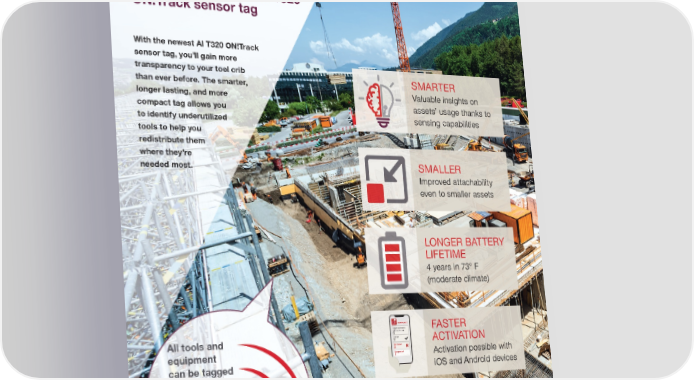 BETTER, SMALLER, SMARTER The next generation AI T320 ON!Track sensor tag SMARTER Valuable insights on assets’ usage thanks to sensing capabilities SMALLER Improved attachability even to smaller assets LONGER BATTERY LIFETIME 4 years in 73° F (moderate climate) Warehouse 2 Not found 3 Expected assets with active tag 6 Found 3 Unexpected 1 FASTER ACTIVATION Activation possible with iOS and Android devices With the newest AI T320 ON!Track sensor tag, you’ll gain more transparency to your tool crib than ever before. The smarter, longer lasting, and more compact tag allows you to identify underutilized tools to help you redistribute them where they’re needed most. CLICK TO LEARN MORE ABOUT ON!TRACK. All tools and equipment can be tagged with ON!Track smart tag ON!Track