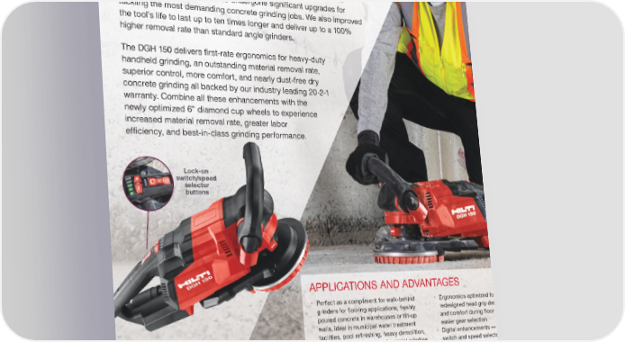 we want to hear from you THE NEW STANDARD FOR PROFESSIONAL GRINDING DGH 150 Concrete grinder + Diamond cup wheels Twenty years of continuous development has lead to this, the new DGH 150 concrete grinder has undergone significant upgrades for tackling the most demanding concrete grinding jobs. We also improved the tool’s life to last up to ten times longer and deliver up to a 100% higher removal rate than standard angle grinders. The DGH 150 delivers first-rate ergonomics for heavy-duty handheld grinding, an outstanding material removal rate, superior control, more comfort, and nearly dust-free dry concrete grinding all backed by our industry leading 20-2-1 warranty. Combine all these enhancements with the newly optimized 6” diamond cup wheels to experience increased material removal rate, greater labor efficiency, and best-in-class grinding performance. APPLICATIONS AND ADVANTAGES • Perfect as a compliment for walk-behind grinders for flooring applications, freshly poured concrete in warehouses or tilt-up walls, ideal in municipal water treatment facilities, pool refinishing, heavy demolition, bridges, and anywhere professional grinding is done • Concrete grinder for heavy-duty grinding or roughening of concrete and removing paint, coatings, and epoxy • Dust-resistant brushless motor — helping the concrete grinder last up to 10x longer than a conventional grinder with a brushed motor • Ergonomics optimized for comfort — redesigned head grip designed for control and comfort during floor applications, plus easier gear selection • Digital enhancements — digital lock-on switch and speed selector • Enhanced safety — Quick-stop almost immediately stops the cup wheel spinning once the trigger is released • Virtually dust free — integrated dust hood with edge opening and height adjustment help to curb airborne dust on your jobsites 722/)/((7 0$1$*(0(17 <($5 :($5$1'7($5 &29(5$*( <($5 /,0,7(' :$55$17< '$< 5(3$,5 7851$5281' Tool warranty. Some limitations apply. Contact Hilti for details. Lock-on switch/speed selector buttons