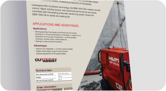 CUT THROUGH WITH CONFIDENCE DSW 1510-CA Wire saw Detach yourself and stay in control with the DSW 1510-CA wire saw, designed to deliver the highest cutting productivity for heavy sawing applications. Steered with a wireless remote control, the DSW 1510-CA provides added operator safety and control, increasing productivity on the jobsite. Leveraging Hilti’s CutAssist technology, the DSW 1510-CA’s wireless remote control, higher starting torque, and maximized performance and power, combined with the existing pneumatic tensioning system allows the DSW 1510-CA to tackle any sawing job. APPLICATIONS AND ADVANTAGES Applications • Sawing anything from heavily reinforced concrete to thick stonework or structural alterations to buildings or infrastructure • Demolition of structural components — such as bridges, chimneys, tunnels, dams, and foundations • Sawing in noise-sensitive locations Advantages • Electric box integrated — no extra cables needed • Higher initial torque to get the wire started • Keyless adjustment of the guide pulleys Technical data Drive dimensions (LxWxH) 33.9 x 27.6 x 92.5 in Weight 761 lb Net wire storage capacity 32.1 f t Order information Description Item number DSW 1510-CA wire saw 3697329