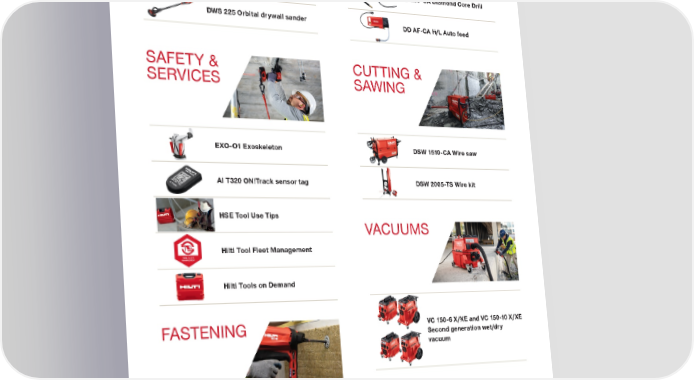 DGH 150 Concrete grinder + cup wheels DWS 225 Orbital drywall sander DD 250-CA Diamond Core Drill DD AF-CA H/L Auto feed DSW 1510-CA Wire saw DSW 2005-TS Wire kit VC 150-6 X/XE and VC 150-10 X/XE Second generation wet/dry vacuum X-IE-GS Insulation fasteners EXO-O1 Exoskeleton AI T320 ON!Track sensor tag HSE Tool Use Tips 722/)/((7 0$1$*(0(17 Hilti Tool Fleet Management Hilti Tools on Demand GRINDING & SANDING DIAMOND CORING CUTTING & SAWING VACUUMS FASTENING SAFETY & SERVICES