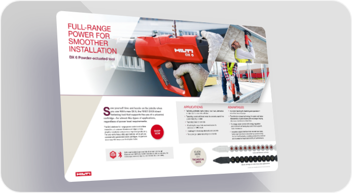 F U L L- R A N G E POWER FOR SMOOTHER INSTA LL ATION DX 6 Powder-actuated tool APPLICATIONS • Fastening perimeter wall or interior wall track, deflection or slip clips to concrete and steel • Fastening wood and sheet metal to concrete, sand-lime block masonry, or steel • Fastening 2x4s to concrete • Attaching drainage foils and membranes to concrete or CMU block • Installing Hilti formstop elements on concrete • Temporary/sill plate fastenings to concrete ADVANTAGES • Improved handling for fastening and operation— smoother, less stoppage • Push-button release technology for easier and faster disassembly of piston/base plate exchange, helping decrease maintenance downtime • Full range power control with energy regulation and intuitive front-facing slip clutch that supports faster installation • Includes a digital interface that records how many fastenings have been completed by synchronizing the tool via Bluetooth, providing productivity and tool service data for improved visibility of performance S ave yourself time and hassle on the jobsite when you use Hilti’s new DX 6, the FIRST EVER direct fastening tool that supports the use of a universal cartridge—for almost ALL types of applications, regardless of power level requirements. The DX 6 delivers full-range power control and utilizes innovative, all-purpose titanium cartridges to help simplify installation and promote improved productivity. For your extra heavy-duty applications, we’ve got you covered with specialized black cartridges. It’s just one more way Hilti helps you finish jobs faster. SHOP NOW Black cartridge for extra heavy-duty applications Universal titanium cartridge With smart tool intelligence and cloud-connectivity through Bluetooth and ON!Track, the DX 6 enables valuable transparency for tool usage, necessary repairs, and informed decision making. $66(7 0$1$*(0(17 75$&. 21 Cartridges only compatible with the DX 6 Powder-actuated tool. CLICK HERE FOR TECHNICAL DATA