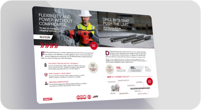 DRILL BITS THAT PUSH THE LIMIT TE-Y Hammer Drill Bit multi-line portfolio D rill through rebar faster and get more life out of your drill bit with Hilti’s SDS Max drill bits. Designed with full carbide four and six cutter heads for ultimate power and performance, our Ultimate TE-Y drill bits help keep your jobsites running efficiently with less stoppage to change out bits. With an extensive portfolio of new and improved drill bits, showcasing multiple diameters and strength, our TE-Y (SDS Max) drill bits cover every application. And with our multi-line approach, it’s easier to choose the right drill bit to meet your needs, every time. NEW! TE-Y HAMMER DRILL BIT CHECK OUT the Ultimate line of TE-YX Hammer drill bits SHOP NOW Large main cutter New Helix Design Multiline ready SDS Max compatibility Laster Marking Side cutter High quality brazing High quality carbide blend FLEXIBILITY AND POWER WITHOUT COMPROMISE TE 500-22 Cordless chipping hammer F eel the performance of a corded chipping hammer with all the maneuverability and runtime of the 22V Nuron cordless platform. From concrete demolition to precise chipping and cutting jobs, the TE 500-22 Cordless chipping hammer helps you power through your work effortlessly. U LTI M ATE Ultimate performance for demanding applications PREMIUM Premium performance for a wide range of applications STANDARD Hilti quality at an economical price SHOP NOW THE NURON CORDLESS BATTERY DIFFERENCE The all-on-one Nuron battery platform allows the TE 500-22 to work longer, smarter, and more efficiently — bringing more work per charge and built-in tool and battery diagnostics with cloud-connected intelligence. MORE DURABILITY, MORE IMPACT Pairing the TE 500-22 with any of Hilti’s variety of self-sharpening TE-YX chisels is designed to maximize your productivity on the jobsite. REDUCING WORKER FATIGUE The TE 500-22 leverages Active Vibration Reduction (AVR) to help minimize your exposure to vibration, especially while working overhead. <($5 :($5$1'7($5 &29(5$*( <($5 /,0,7(' :$55$17< '$< 5(3$,5 7851$5281' TOOL FLEET MANAGEMENT CLICK HERE FOR TECHNICAL DATA