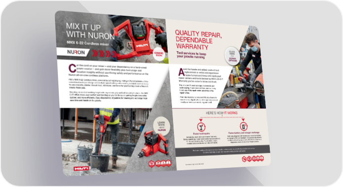 MIX IT UP WITH NURON NMX 6-22 Cordless mixer C ut the cord on your mixer — and your dependency on a hard-wired power source — and gain more flexibility plus tool usage and location insights without sacrificing safety and performance on the Nuron all-on-one cordless platform. Hilti’s NMX 6-22 Cordless mixer, powered by self-optimizing, intelligent Nuron batteries, offers unmatched work per charge and multiple speed settings when mixing materials such as ready- to-use concrete, plaster, drywall mud, adhesives, and more for your building construction and interior finish jobs. Standing at an ideal working height with ergonomic grip and built-in safety features, the NMX 6-22 offers more user comfort and handling so you can focus on getting the job done safer, quicker, and more efficiently. Easy disassembly of paddles for cleaning and exchange helps save time and hassle on the jobsite. COMING SOON LEARN MORE ABOUT NURON WEAR AND TEAR COVERAGE LIMITED WA RRANTY REP AIR TURNAROUND TOOL FLEET MANAGEMENT HERE’S HOW IT WORKS TOOL FLEET MANAGEMENT <($5 :($5$1'7($5 &29(5$*( <($5 /,0,7(' :$55$17< '$< 5(3$,5 7851$5281' QUALITY REPAIR, DEPENDABLE WARRANTY Tool services to keep your jobsite running void the hassle and added costs of tool replacement or rental and experience faster turnaround times with dedicated repair centers and tools backed by Hilti’s 20-2-1* Warranty you’ve come to know and trust. This includes 20-year coverage on materials and workmanship, 2-year wear and tear, and our 1-day in and out of the repair center guarantee or the repair is free. From our customer service and Hilti store teams to easier-to-use digital options, we’ve got you covered for all your tool repair needs, big and small. Faster tool repairs Faster battery and charger exchange Scheduling repair pick-ups is easier than ever. Simply submit your repair order and schedule a pick-up for the next business day. To schedule a repair, contact Customer Service at 1-800-879-8000. We’ll help diagnose and replace your in-service battery or charger within our standard 1–3 business day delivery window, without having to visit a Hilti Store or wait for a diagnostic check at one of our Repair Centers. We know dealing with repairs can be a hassle — which is why we provide dependable tool service solutions that help you get back up and running quicker and easier. CLICK HERE FOR REPAIR OPTIONS A *Some limitations apply. Contact Hilti for details.