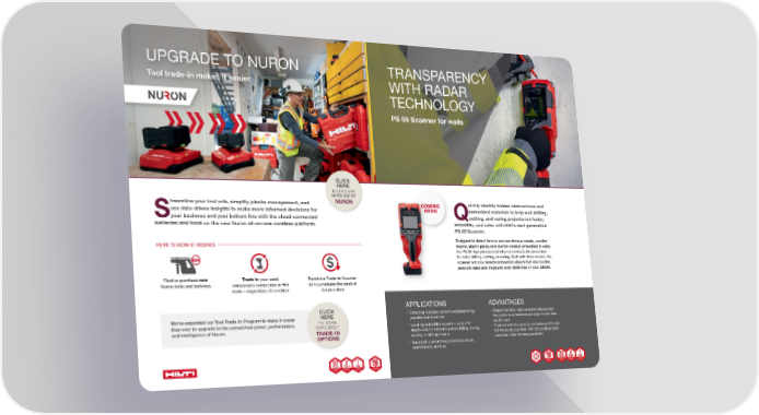 COMING SOON S treamline your tool crib, simplify jobsite management, and use data-driven insights to make more informed decisions for your business and your bottom line with the cloud-connected batteries and tools on the new Nuron all-on-one cordless platform. <($5 :($5$1'7($5 &29(5$*( <($5 /,0,7(' :$55$17< '$< 5(3$,5 7851$5281' TOOL FLEET MANAGEMENT UPGRADE TO NURON Tool trade-in makes it easier We’ve expanded our Tool Trade-In Program to make it easier than ever to upgrade to the unmatched power, performance, and intelligence of Nuron. WEAR AND TEAR COVERAGE LIMITED WA RRANTY REP AIR TURNAROUND TOOL FLEET MANAGEMENT Q uickly identify hidden obstructions and embedded materials to help wall drilling, cutting, and coring projects run faster, smoother, and safer with Hilti’s next generation PS 85 Scanner. Designed to detect ferrous and non-ferrous metals, wooden beams, plastic pipes, and electric conduit embedded in walls, the PS 85 has you covered when it comes to hit prevention for safer drilling, cutting, or coring. Built with three modes, the scanner not only detects embedded objects but also locates possible leaks and measures scan distances on your jobsite. TRANSPARENCY WITH RADAR TECHNOLOGY PS 85 Scanner for walls APPLICATIONS • Detecting moisture content and determining possible leak locations • Locating embedded objects — up to 3 ⅔ " depth — for hit prevention when drilling, coring, cutting, or slitting in walls • Equipped to scan through concrete, brick, plasterboard, and tiles ADVANTAGES • Simple interface, high resolution display and the option to screenshot and export scan data via SD card • Powered with the same Li-ion batteries (2.6 and 4.0 Ah) as all your other Hilti 12V cordless tools • Less than 2 lbs. for easy portability Receive a Trade-in Voucher to help reduce the cost of future orders Trade-in your used comparable competitor or Hilti tools — regardless of condition Fleet or purchase new Nuron tools and batteries HERE’S HOW IT WORKS CLICK HERE TO DISCOVER MORE ABOUT NURON CLICK HERE TO LEARN MORE ABOUT TRADE-IN OPTIONS