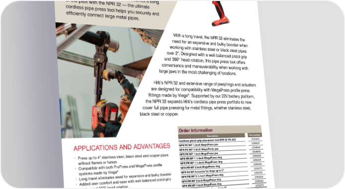 we want to hear from you 722/)/((7 0$1$*(0(17 <($5 :($5$1'7($5 &29(5$*( <($5 /,0,7(' :$55$17< '$< 5(3$,5 7851$5281' Tool warranty. Some limitations apply. Contact Hilti for details. ONE PRESS TOOL TO PRESS THEM ALL Cordless pistol-grip pipe press tool NPR 32 PE-A22 Dealing with flames and fumes becomes a thing of the past with the NPR 32 — the ultimate cordless pipe press tool helps you securely and efficiently connect large metal pipes. APPLICATIONS AND ADVANTAGES • Press up to 4” stainless steel, black steel and copper pipes without flames or fumes • Compatible with both ProPress and MegaPress profile systems made by Viega ® • Long travel eliminates need for expensive and bulky booster • Added user comfort and ease with well-balanced pistol grip design and 350° head rotation Technical data Press force 32 kN/7200 lbs. Dimensions (LxWxH) 20.5 x 3.27 x 9.6 in Head rotation 350° Rated voltage 21.6V Weight 8 lbs Order information Description Item number Cordless pistol-grip pipe press tool NPR 32 PE-A22 2195303 NPR PS MP ½ inch MegaPress jaw 2294847 NPR PS MP ¾ inch MegaPress jaw 2294848 NPR PS MP 1 inch MegaPress jaw 2294849 NPR PR MP 1-¼ inch MegaPress ring 2295060 NPR PR MP 1-½ inch MegaPress ring 2295061 NPR PR MP 2 inch MegaPress ring 2295062 NPR PA MP Actuator for rings up to 2” 2206272 NPR PR MP 2-½ inch MegaPress ring 2295063 NPR PR MP 3 inch MegaPress ring 2295064 NPR PR MP 4 inch MegaPress ring 2295065 NPR PA MP Actuator for rings above 2” 2206273 Accessories Description Item number Battery 22V 2.6 Ah Li-ion 2136395 Battery 22V 4.0 Ah Li-ion 2183182 High speed battery charger C 4/36 350 2028878 Compact battery charger C 4/36 90 2015764 With a long travel, the NPR 32 eliminates the need for an expensive and bulky booster when working with stainless steel or black steel pipes over 2”. Designed with a well-balanced pistol grip and 350° head rotation, this pipe press tool offers convenience and maneuverability when working with large jaws in the most challenging of locations. Hilti’s NPR 32 and extensive range of jaws/rings and actuators are designed for compatibility with MegaPress profile press fittings made by Viega ® . Supported by our 22V battery platform, the NPR 32 expands Hilti’s cordless pipe press portfolio to now cover full pipe pressing for metal fittings, whether stainless steel, black steel or copper.