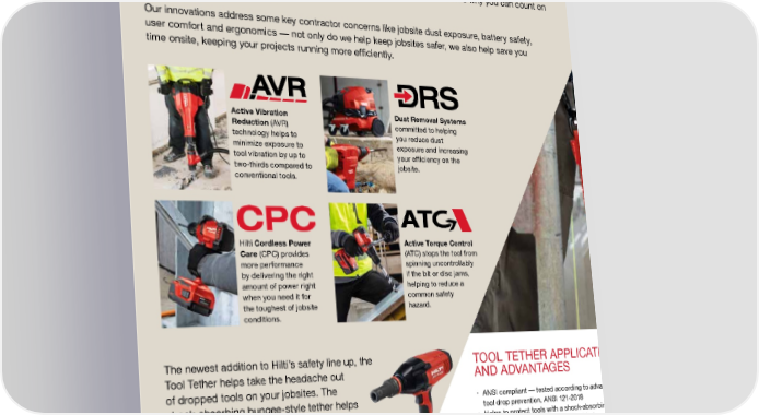 WORK SAFER, WORK MORE SECURELY Tools and technologies designed with safety first Hilti’s unwavering commitment to safety means that our innovations are developed with consideration of the health, safety, and environmental aspects of the toughest of jobsites. That’s why you can count on our solution-driven technologies. Our innovations address some key contractor concerns like jobsite dust exposure, battery safety, user comfort and ergonomics — not only do we help keep jobsites safer, we also help save you time onsite, keeping your projects running more efficiently. Active Vibration Reduction (AVR) technology helps to minimize exposure to tool vibration by up to two-thirds compared to conventional tools. Dust Removal Systems committed to helping you reduce dust exposure and increasing your efficiency on the jobsite. Hilti Cordless Power Care (CPC) provides more performance by delivering the right amount of power right when you need it for the toughest of jobsite conditions. Active Torque Control (ATC) stops the tool from spinning uncontrollably if the bit or disc jams, helping to reduce a common safety hazard. we want to hear from you TOOL TETHER APPLICATIONS AND ADVANTAGES • ANSI compliant — tested according to advanced standards on tool drop prevention, ANSI 121-2018 • Helps to protect tools with a shock-absorbing bungee tether tested to reduce risks associated with drops • Self-locking carabiner makes it easier to operate with one hand, and is designed to hinder accidental opening • Clear labeling with the weight limit and key information shown on every lanyard The newest addition to Hilti’s safety line up, the Tool Tether helps take the headache out of d ropped t ools o n y our j obsites. T he s hock-absorbing b ungee-style t ether h elps reduce potential damage to the tool, injury to w orkers, a nd sl ow d owns o n t he j obsite. They are designed for use with Hilti tools and backed by testing that goes bey ond current industry standards by considering the tool, attachment point, tool tethe r, and inserts/accessories. For more information see Hilti’s tethering white paper