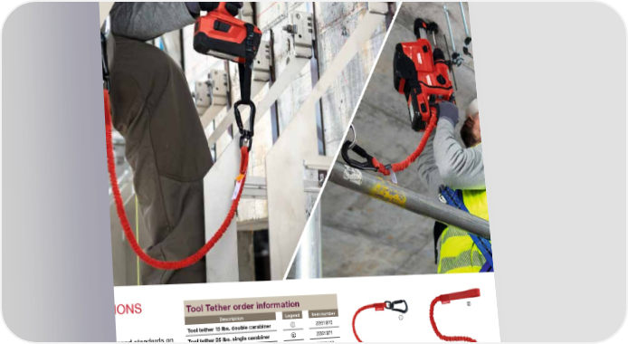 Hilti’s unwavering commitment to safety means that our innovations are developed with consideration of the health, safety, and environmental aspects of the toughest of jobsites. That’s why you can count on our solution-driven technologies. Our innovations address some key contractor concerns like jobsite dust exposure, battery safety, user comfort and ergonomics — not only do we help keep jobsites safer, we also help save you time onsite, keeping your projects running more efficiently. TOOL TETHER APPLICATIONS AND ADVANTAGES • ANSI compliant — tested according to advanced standards on tool drop prevention, ANSI 121-2018 • Helps to protect tools with a shock-absorbing bungee tether tested to reduce risks associated with drops • Self-locking carabiner makes it easier to operate with one hand, and is designed to hinder accidental opening • Clear labeling with the weight limit and key information shown on every lanyard ① ② ③ Tool Tether order information Description Legend Item number Tool tether 15 lbs. double carabiner ① 2261970 Tool tether 25 lbs. single carabiner ② 2261971 Cordless retaining strap ③ 2293133