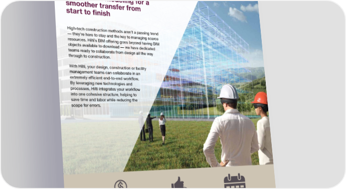 we want to hear from you GET HILTI INVOLVED. CLICK TO LEARN MORE. Collaborate with us to see how end-to-end digitization can benefit your business. END-TO-END CONSTRUCTION WORKFLOW Design and modeling for a smoother transfer from start to finish High-tech construction methods aren’t a passing trend — they’re here to stay and the key to managing scarce resources. Hilti’s BIM offering goes beyond having BIM objects available to download — we have dedicated teams ready to collaborate from design all the way through to construction. With Hilti, your design, construction or facility management teams can collaborate in an extremely efficient end-to-end workflow. By leveraging new technologies and processes, Hilti integrates your workflow into one cohesive structure, helping to save time and labor while reducing the scope for errors. SIGNIFICANT REDUCTION In on-site engineering decisions due to advance planning UP TO 50% Max. material saving UP TO 4-6 WEEKS Labor saving potential