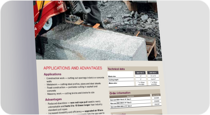 722/)/((7 0$1$*(0(17 Technical data DSH 700-X DSH 900-X Blade size 14” 14” or 16” Cutting depth 5” Up to 6” Blade arbor 1” or 20mm reversible 1” or 20mm reversible Order information Description Item number Gas saw DSH 700-X 14" Gen.3 2265864 Gas saw DSH 900-X 14" Gen.3 2265865 Gas saw DSH 900-X 16" Gen.3 2265707 Accessories Description Item number Self-priming pump DSH-P 2124505 Floor saw cart DSH-FSC 431364 APPLICATIONS AND ADVANTAGES Applications • Construction work — cutting out openings in brick or concrete walls • Metalwork — cutting steel profiles, pipes and steel sheets • Road construction — perimeter cutting in asphalt and concrete • Masonry work — cutting bricks and blocks to size Advantages • Reduced downtime — new red rope pull cord is nearly unbreakable and lasts 5 to 10 times longer than industry standard pull ropes • Increased durability and efficiency — upgraded air filters and re-engineered internal components help the gas saw to deliver uninterrupted, high performance • Most versatile gas cut-off saw in its class — even convertible to flush-cut mode • Easy-start gas saw — unique auto-choke helps to make first- pull ignition the norm • Simplified blade changes — new multi-key holder helps keep track of maintenance tool • Compatible with the DSH-P water pump — feeds water to your gas saw from any source, no pressure source needed
