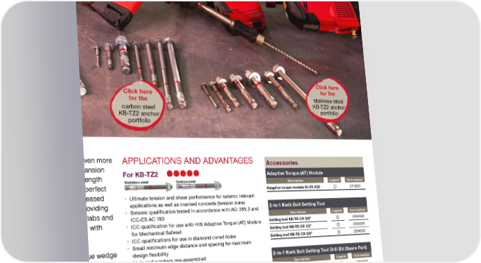 We’ve expanded our portfolio size with even more cracked concrete, seismic approved expansion anchors, and we’ve increased standard length options giving you the ability to pick the perfect size anchor for the job. Hilti has also increased our approvals for embedment depths, providing the best performance in the thinnest of slabs and the KB-TZ2 is the only expansion anchor with diamond cored hole approvals. With new functional coatings and a unique wedge design, Hilti has created expansion anchors with 20% greater tension values compared to our previous KB-TZ, and the best edge and spacing in the industry. Offering increased performance, an expanded portfolio, and more approvals, the KB-TZ2 and KB1 can be used in more application and jobsite conditions than any other expansion anchor. Start making anchoring easier with the KB-TZ2 and KB1. Accessories Adaptive Torque (AT) Module Description Legend Item number Adaptive torque module SI-AT-A22 ① 21126 51 2-in-1 Kwik Bolt Setting Tool Description Legend Item number Setting tool KB-TE-CX 3/8" 2204328 Setting tool KB-TE-CX 1/2" 2204329 Setting tool KB-TE-CX 5/8" 2204330 2-in-1 Kwik Bolt Setting Tool Drill Bit (Spare Part) Description Legend Item number Stop drill bit KB-TE-CX-B 3/8" ③ 2204321 Stop drill bit KB-TE-CX-B 1/2" ③ 2204322 Stop drill bit KB-TE-CX-B 5/8" ③ 2204323 APPLICATIONS AND ADVANTAGES For KB-TZ2 • Ultimate tension and shear performance for seismic relevant applications as well as cracked concrete (tension zone) • Seismic qualification tested in accordance with ACI 355.2 and ICC-ES AC 193 • ICC qualification for use with Hilti Adaptive Torque (AT) Module for Mechanical Safeset • ICC qualifications for use in diamond cored holes • Small minimum edge distance and spacing for maximum design flexibility • Nuts and washers pre-assembled For KB1 • Premium tension and shear performance for seismic and cracked concrete applications (tension zone) • Seismic qualification tested in accordance with ACI 355.2 and ICC-ES AC 193 • ICC qualification for use with Hilti Adaptive Torque (AT) Module for Mechanical SafeSet Click here for the carbon steel KB-TZ2 anchor portfolio Click here for the stainless steel KB-TZ2 anchor portfolio Carbon steel Stainless steel Carbon steel