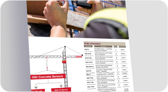 Order information Item name Description Legend Item number HCS T2 Temperature Sensor — Long Range (requires HCS Gateway) ① 2300657 HCS T2-B3 HCS T2 with 3-foot cord for deeper sensor embedment ② 2300658 HCS T2-B8 HCS T2 with 8-foot cord for deeper sensor embedment ② 2300659 HCS T2-B15 HCS T2 with 15-foot cord for deeper sensor embedment ② 2300660 HCS Gateway Monthly Rental for HCS Gateway (required for all HCS T2) ③ 3692417 HCS TH1 Temperature / Relative Humidity Sensor — Bluetooth ® ① 2300652 HCS T1 Temperature Sensor — Bluetooth ® ① 2300653 HCS T1-B3 HCS T1 with 3-foot cord for deeper sensor embedment ② 2300654 HCS T1-B8 HCS T1 with 8-foot cord for deeper sensor embedment ② 2300655 HCS T1-B15 HCS T1 with 15-foot cord for deeper sensor embedment ② 2300656 HCS Concrete Calibration Testing Required for accurate monitoring of concrete strength based on Maturity Method. Calibration testing: Ultimate: at 4 temperatures Premium: at 1 temperature 3707068 (Ultimate) 3707069 (Premium) Hilti Concrete Sensors up to 100 ft up to 1,000 ft HCS-TH1 and HCS-T1 Sensors use Bluetooth to collect data at distances up to 100 feet with active app. HCS-T2 Sensors use Long Range technology to collect data at distances up to 1,000 feet. Requires the rental of a Hilti Gateway. ① ② ③