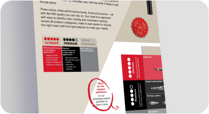 we want to hear from you WE’VE ADDED MORE CONSUMABLES TO MEET YOUR NEEDS Whatever the job, whatever the budget Whether you need ultimate performance for a demanding situation or amore reliable product for everyday use, Hilti has what it takes to get the job done. Three colors, three performance levels, three price points — all with the Hilti quality you can rely on. Our three line approach with easy to identify color coding and consistent naming across all product categories, make it even easier to choose the right insert with the right balance to meet your needs. Click on the newest additions to our extensive inserts portfolio to learn more Ultimate Ultimate performance for demanding applications Premium Premium performance for a wide range of applications Standard Hilti quality at economical price Line Application Insert bits Bits/bit holder for installing metal framing screws Impact ready stepper bits Impact ready stepper bits with spiral flutes for fast drilling and enlarging holes in metal TCT Hole cutters Hole cutter with carbide teeth to drill through metal sheets and plates, including stainless and tough metals. Spring to eject the slug. Self feed bit Fast, continuous self-feeding bit to drill deep holes up to 4” diameter 8” Auger bits Auger bits ideal for drilling in timber between joists, with self feeding tip capable of cutting nails U LT I M AT E PREMIUM STANDARD Ultimate performance for demanding applications • Highest overall productivity and safety benefits • Highest reliability in toughest conditions Premium performance for a wide range of applications • High productivity through Hilti system solutions • Impressive versatility and reliability Hilti quality at an economical price
