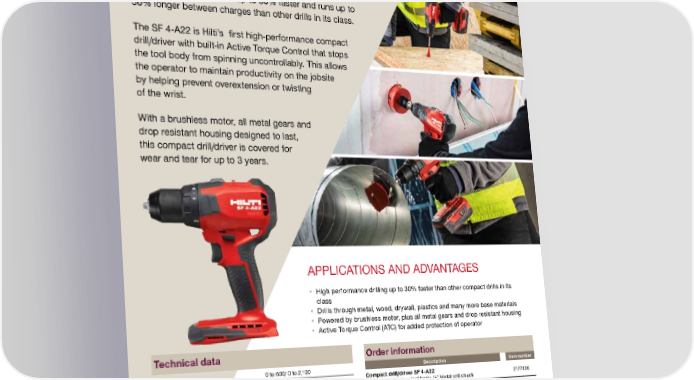 APPLICATIONS AND ADVANTAGES • High performance drilling up to 30% faster than other compact drills in its class • Drills through metal, wood, drywall, plastics and many more base materials • Powered by brushless motor, plus all metal gears and drop resistant housing • Active Torque Control (ATC) for added protection of operator Order information Description Item number Compact drill/driver SF 4-A22 Includes: Drill/driver tool body, ½” Metal drill chuck 21774 0 6 Accessories Description Item number Battery 22V 2.6 Ah Li-ion 2136395 Compact charger C4/36-90 2015764 Medium soft bag 434910 722/)/((7 0$1$*(0(17 <($5 :($5$1'7($5 &29(5$*( <($5 /,0,7(' :$55$17< '$< 5(3$,5 7851$5281' Tool warranty. Some limitations apply. Contact Hilti for details. FASTER DRILLING — LESS STRESS ON WRISTS Compact drill/driver SF 4-A22 Delivering powerhouse performance, Hilti’s new compact drill/driver SF 4-A22 drills up to 30% faster and runs up to 30% longer between charges than other drills in its class. The SF 4-A22 is Hilti’s first high-performance compact drill/driver with built-in Active Torque Control that stops the tool body from spinning uncontrollably. This allows the operator to maintain productivity on the jobsite by helping prevent overextension or twisting of the wrist. With a brushless motor, all metal gears and drop resistant housing designed to last, this compact drill/driver is covered for wear and tear for up to 3 years. Technical data RPM 0 to 600/ 0 to 2,100 Active Torque Control (ATC) Ye s Maximum torque (Soft / Hard Joint) 314 in-lb / 549 in-lb Metal chuck size 1/2" Dimensions (LxWxH) 7 x 2.5 x 9.8 in Weight (tool only) 2.8 lbs LED Ye s Clutch settings 1/4" Rated voltage 21.6V