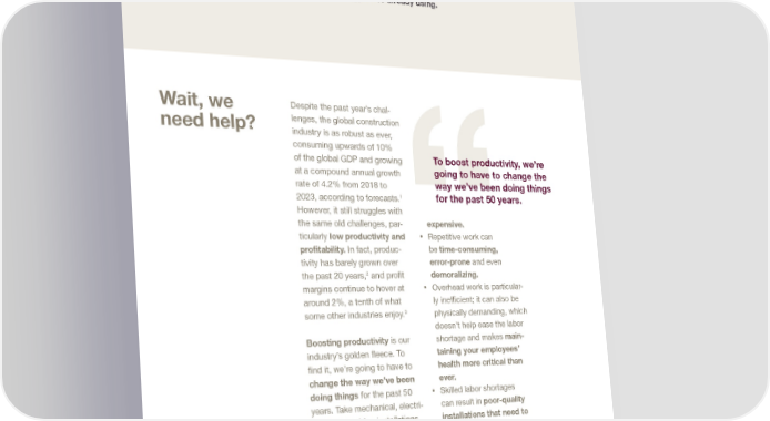 Despite the past years chal - lenges, the global construction industry is as robust as ever, consuming upwards of 10% of the global GDP and growing at a compound annual growth rate of 4.2% from 2018 to 2023, according to forecasts. 1 However, it still struggles with the same old challenges, par - ticularly low productivity and profitability. In fact, produc - tivity has barely grown over the past 20 years, 2 and profit margins continue to hover at around 2%, a tenth of what some other industries enjoy. 3 Boosting productivity is our industrys golden fleece. To find it, were going to have to change the way weve been doing things for the past 50 years. Take mechanical, electri - cal and plumbing installations, for example: Mistakes in planning and execution can lead to inefficient on-site improvi - sations and costly rework. Coordinating multiple play - ers with overlapping applica - tions can be complex and Wait, we need help? Introduction The robots are coming! Actually, theyre already here in their less sensational forms of digitization and automation and ready to help us tackle our industrys biggest challenges: inefficiencies, low productivity and labor shortages. Best of all, they can do it with technology were already using. expensive. Repetitive work can be time-consuming, error-prone and even demoralizing. Overhead work is particular - ly inefficient; it can also be physically demanding, which doesnt help ease the labor shortage and makes main - taining your employees health more critical than ever. Skilled labor shortages can result in poor-quality installations that need to be redone. Even a slight bump in pro - ductivity can translate to a significant amount of money, especially on multimillion-dollar projects. The World Economic Forum estimates that just a 1% rise in construction To boost productivity, were going to have to change the way weve been doing things for the past 50 years. JOBSITE AUTOMATION 2