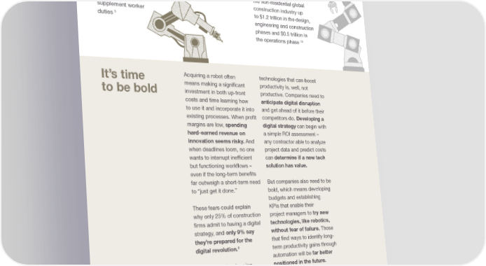 Acquiring a robot often means making a significant investment in both up-front costs and time learning how to use it and incorporate it into existing processes. When profit margins are low, spending hard-earned revenue on innovation seems risky. And when deadlines loom, no one wants to interrupt inefficient but functioning workflows even if the long-term benefits far outweigh a short-term need to just get it done. These fears could explain why only 25% of construction firms admit to having a digital strategy, and only 9% say theyre prepared for the digital revolution. 3 However, not embracing REFERENCES 1. Growth Opportunities in the Global Construction Industry. https://www.researchandmarkets.com/ reports/4439921/growth-opportunities-in-the-global-construction 2. Reinventing Construction: A route to Higher Productivity. https://www.mckinsey.com/~/media/ McKinsey/Business%20Functions/Operations/Our%20Insights/Reinventing%20construction%20 through%20a%20productivity%20revolution/MGI-Reinventing-Construction-Executive-summary.pdf 3. Technological Advancements Disrupting the Global Construction Industry. https://www.docu - mentcloud.org/documents/6838866-Ottinger-Minglani-and-Gibson-Technological.html 4. Construction Industry Needs Additional 430,000 Craft Professionals in 2021. https://www. contractormag.com/construction-data/article/21159144/construction-industry-needs-addition - al-430000-craft-professionals-in-2021 5. 80 Percent of Contractors Report Difficulty Finding Qualified Workers. https://www.agc.org/news/2019/08/27/eighty-percent-contractors-report-difficulty-finding-quali - fied-craft-workers-hire-0 6. Harnessing Automation for a Future That Works. https://www.mckinsey.com/featured-insights/ digital-disruption/harnessing-automation-for-a-future-that-works 7. Having Shed Young Workers, the Construction Industry Needs Change. https://www.buildzoom. com/blog/having-shed-young-workers-the-construction-industry-needs-change 8. Connected Construction: A Better Way to Build Together. https://construction.autodesk.eu/resourc - es/construction-connected/ 9. USG + U.S. Chamber of Commerce Commercial Construction Index - 2019 Q4. https://www. uschamber.com/report/usg-us-chamber-of-commerce-commercial-construction-index-2019-q4 10. Shaping the Future of Construction: A Breakthrough in Mindset and Technology. http://www3. weforum.org/docs/WEF_Shaping_the_Future_of_Construction_full_report__.pdf Its time to be bold technologies that can boost productivity is, well, not productive. Companies need to anticipate digital disruption and get ahead of it before their competitors do. Developing a digital strategy can begin with a simple ROI assessment any contractor able to analyze project data and predict costs can determine if a new tech solution has value. But companies also need to be bold, which means developing budgets and establishing KPIs that enable their project managers to try new technologies, like robotics, without fear of failure. Those that find ways to identify long- term productivity gains through automation will be far better positioned in the future. 29 % of construction companies report already investing in technology to supplement worker duties 5 $1.2 trn Within 10 years, full-scale digitization could save the non-residential global construction industry up to $1.2 trillion in the design, engineering and construction phases and $0.5 trillion in the operations phase 10 70 % of contractors say that advanced technologies could increase productivity (78%), improve schedule (75%), and enhance safety (79%) 9 JOBSITE AUTOMATION 5 FIND OUT MORE Hilti US | Hilti Canada US Customer Service 1-800-879-8000 | CA Customer Service 1-800-363-4458