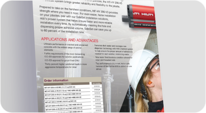 ANCHORS SET FOR SUCCESS HIT-HY 200-A/R V3 Adhesive anchor + SafeSet Experience increased anchor durability and performance in concrete and masonry with our next generation adhesive anchor, HIT-HY 200-V3. Through continuous innovation of our adhesive anchor portfolio, the HIT-HY 200-V3 and SafeSet system brings greater reliability and flexibility to the jobsite. Prepared to take on the harshest conditions, HIT-HY 200-V3 provides strength where you need it most. For even easier, faster installation on your jobsites, pair with our SafeSet installation solutions, Hilit’s proven system that helps ensure faster and more reliable installation every time. By automatically cleaning the hole and dispensing proper adhesive volume, SafeSet can save you up to 60 percent of the installation time. we want to hear from you • U ltimate performance in cracked and uncracked concrete with the widest range of anchor elements • F ulfills requirements of the most demanding ICC-ES approvals for seismic applications • I CC-ES approval for grout-filled CMU • T hirty percent higher published loads in more aggressive temperatures for rebar • Rem oves dust easier and leverages new dis pens er technology with Hilti’s SafeSet system to help ensure the proper amount of adhesive is needed for each anchor, minimizing waste • New water filled borehole condition allowed for rebar and threaded rods • Top performance in dry or wet, hot or cold, hamm er-drille d , hollow drill bit drilled, or core dr illed. APPLICATIONS AND ADVANTAGES Order information Description Item number HIT-HY 200-A V3 MC (11.1 fl oz/330 ml) 3778123 HIT-HY 200-A V3 (11.1 fl oz) 1 MC+HDE 500-22 3778124 HIT-HY 200-A V3 (11.1 fl oz) 2 MC+HDE 500-22 3778125 HIT-HY 200-A V3 (11.1 fl oz) 5 MC+HDE 500-22 3778126 HIT-HY 200-A V3 MC (16.9 fl oz/500 ml) 3778127 HIT-HY 200-A V3 (16.9 fl oz) 1 MC+HDE 500-22 3778128 HIT-HY 200-A V3 (16.9 fl oz) 2 MC+HDE 500-22 3778129 HIT-HY 200-A V3 (16.9 fl oz) 5 MC+HDE 500-22 3778130 HIT-HY 200-R V3 MC (11.1 fl oz/330 ml) 3778131 HIT-HY 200-R V3 (11.1 fl oz) 1 MC+HDE 500-22 3778132 HIT-HY 200-R V3 (11.1 fl oz) 2 MC+HDE 500-22 3778133 HIT-HY 200-R V3 (11.1 fl oz) 5 MC+HDE 500-22 3778134 HIT-HY 200-R V3 MC (16.9 fl oz/500 ml) 3778135 HIT-HY 200-R V3 (16.9 fl oz) 1 MC+HDE 500-22 3778136 HIT-HY 200-R V3 (16.9 fl oz) 2 MC+HDE 500-22 3778137 HIT-HY 200-R V3 (16.9 fl oz) 5 MC+HDE 500-22 3778138
