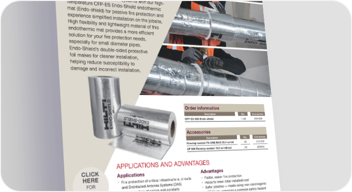 we want to hear from you FASTER, S AFER FIRE P ROTECTION CFP-ES E ndo-Shield e ndothermic m at Protect critical cable circuits, fuel lines, communication sys tems and various MEP systems with our high- temperature CFP-ES Endo-Shield endot hermic mat (Endo-shield) for passive fire pr otect ion and experience simplified ins tallation on the jobsite. High f lexibility a nd l ightweight m aterial o f t his endothermic m at p rovides a mo re e fficient s olution for your fire protection needs, especially for small diameter pipes. Endo-Shield’s d ouble-sided p rotective foil makes for cleaner installation, helping r educe su sceptibility t o damage and incorrect installation. Order information Description Qty Item number CFP-ES Hilti Endo-shield 1 roll 2331829 Accessories Description 99 Qty Item number Firestop sealant FS-ONE MAX 20.0 oz foil 20 2101532 CP 606 Firestop sealant 19.6 oz foil red 20 209634 CLICK HERE FOR Technical data Applications • F ire protection of critical infrastructure, circuits and Distributed Antenna Systems (DAS) • F ire protection of cables and conduits • P rotecting fuel oil piping from fire — such as for backup generators • I ncreasing the T rating of conduit, EMT or pipe penetrations — such as through floors in electrical, data or mechanical rooms • F ire protection of large membrane penetrations — such as recessed electrical boxes/panels in rated barriers, fire extinguisher cabinets or medical gas box outlets Advantages • F aster, easier fire protection • H elps to lower total installed cost • S afer jobsites — made using non-carcinogenic LPB fibers, removing a common safety hazard for installers and benefiting complex healthcare building projects • E xtensive third-party performance verification — tested to ASTM E1725 for circuit integrity and UL1489 for fuel pipe protection Hilti Firestop Saving lives through innovation and education APPLICATIONS AND ADVANTAGES