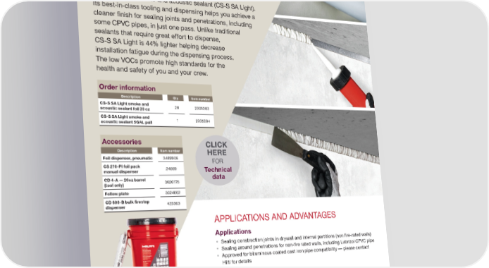 LIGH TWEIGHT F OR Q UICKER INS TAL LATION CS-S SA Light smoke and acoustic sealant Experience faster and more efficient installation with our CS-S SA Light smoke and acoustic sealant (CS -S SA Light). Its best-in-class tooling and dispensing helps you achieve a cleaner finish for sealing joints and penetrations, including some CPVC pipes, in just one pass. Unlike traditional sealants that require great effort to dispense, CS-S SA Light is 4 4% lighter helping decrease installation fatigue during the dispensing process. The low VOCs promote high standar ds for the health a nd s afety o f y ou a nd y our c rew. Order information Description Qty Item number CS-S SA Light smoke and acoustic sealant foil 20 oz 20 2305383 CS-S SA Light smoke and acoustic sealant 5GAL pail 1 2305384 Accessories Description Item number Foil dispenser, pneumatic 3489906 CS 270-PI foil pack manual dispenser 24669 CD 4-A — 20oz barrel (tool only) 3626175 Follow plate 3024002 CD 600-B bulk firestop dispenser 423363 CLICK HERE FOR Technical data APPLICATIONS AND ADVANTAGES Applications • S ealing construction joints in drywall and internal partitions (non fire-rated walls) • S ealing around penetrations for non-fire rated walls, including Lubrizol CPVC pipe • A pproved for bituminous coated cast iron pipe compatibility — please contact Hilti for details Advantages • Ra pid installation — lighter weight allows for easy installation, helping you quickly move on to your next project • FB C™ System Compatible — sealant suitable for a wide range of Lubrizol CPVC pipes and fittings, check with Lubrizol for more information. • M ade in the USA — for shorter lead times and supporting local jobs • L ow VOCs — smoke and acoustic sealant formulated to meet LEED ® V4 project requirements and healthcare industry building standards Hilti Firestop Saving lives through innovation and education