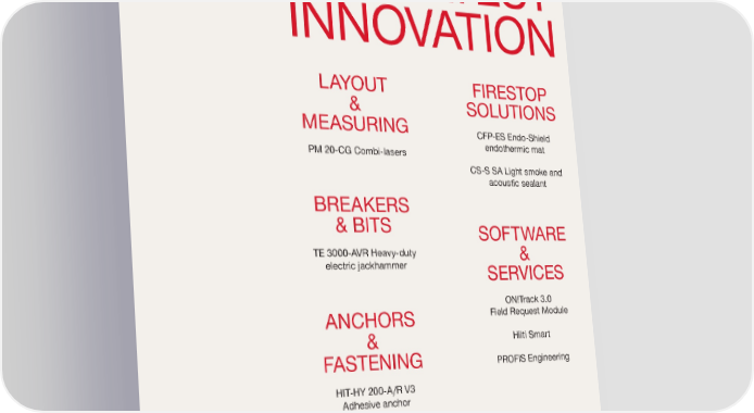 THE L AT EST INNOVATION L AYOU T & MEASURING PM 20-CG Combi-lasers BREAKERS & BITS TE 3000-AVR Heavy-duty electric jackhammer ANCHORS & FASTENING HIT-HY 200-A/R V3 Adhesive anchor TE-YX Hammer drill bits Wire hanger system FIRESTOP SOLUTIONS CFP-ES Endo-Shield endothermic mat CS-S SA Light smoke and acoustic sealant SOFTWARE & SERVICES ON!Track 3.0 Field Request Module Hilti Smart PROFIS Engineering
