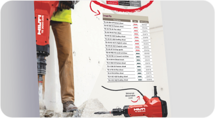 722/)/((7 0$1$*(0(17 <($5 :($5$1'7($5 &29(5$*( <($5 /,0,7(' :$55$17< '$< 5(3$,5 7851$5281' Tool warranty. Some limitations apply. Contact Hilti for details. Order information Description Item number TE 3000-AVR 2229035 Performance package 374 014 4 Accessories Description Item number TE 3000 Power supply cord 2186609 TE DRS-H Dust removal system 2268007 Inserts Description Line Item number TE-HX SM 40 Pointed chisel 2254657 TE-HX SM 50 Pointed chisel 2254658 TE-HX FM 40 Flat chisel 2 25 4774 TE-HX FM 50 Flat chisel 2254775 TE-HX SC 40/8 Scaling chisel 2254769 TE-HX SC 50/8 Scaling chisel 2254770 TE-HX AC 42/12 Asphalt cutter 2254755 TE-HX AC 50/12 Asphalt cutter 2254757 TE-HX SP 50 Clay spade 2254759 TE-HX RD 2 Ground rod driver 2254762 TE-HX RD 2.5 Ground rod driver 2254763 TE-H SH 40 Chisel shank 2254761 TE-H SM 40 Pointed chisel 2254751 TE-H SM 50 Pointed chisel 2254752 TE-H FM 40 Flat chisel 2254778 TE-H FM 50 Flat chisel 2254779 TE-H SC 40/8 Scaling chisel 2254773 TE-H SC 50/8 Scaling chisel 2254765 Universal detachable cord A multiline portfolio of newly designed TE-H chisels — offering ultimate chisels for the most performance and longest life and premium chisels for the best economical option. CHOOSE THE BEST SOLUTION FOR YOU Ul timate P remium S tandard Ultimate performance for demanding applications Premium performance for a wide range of applications Hilti quality at an economical price