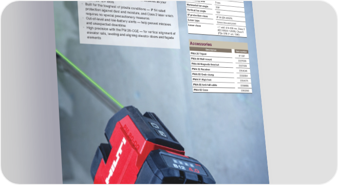 TOOL FLEET MANAGEMENT 2 YEAR WEAR AND TEAR COVERAGE 20 YEAR LIMITED WARRANTY 1 DAY REPAIR TURNAROUND Tool warranty. Some limitations apply. Contact Hilti for details. APPLICATIONS AND ADVANTAGES • B etter visibility up to 66 ft — green beam makes for easier indoor use and in bright light for transferring position and fastening points overhead • H igh-speed layout — compact, self-leveling cross line laser with magnetic bracket so you can get started with minimal setup time • U p to 5 days of continuous layout work per charge with the PM-20-CG A12 — powered by the same batteries as your other Hilti 12V tools • B uilt for the toughest of jobsite conditions — IP 54 rated protection against dust and moisture, and Class 2 laser which requires no special precautionary measures • O ut-of-level and low-battery alerts — help prevent mistakes and unexpected downtime • H igh precision with the PM 20-CGE — for vertical alignment of elevator rails, leveling and aligning elevator doors and façade elements Technical data Accuracy +/- .12 inch at 33 feet Max operating distance (lines) 131 ft Max operating distance with receiver (lines) 328 ft Self-leveling range at room temperature 4° Self-leveling time 3 sec Horizontal fan angle 200° Vertical fan angle 160° IP protection class IP 54 (EN 60529) Laser type Green line and point Laser class < 1 mW, 510-530 nm, Class 2 (IEC 60825-1:2008), Class II (FDA CFR 21 art. 1040) Accessories Description Item number PMA 20 Tripod 411287 PMA 90 Wall mount 2227009 PMA 89 Magnetic bracket 2227008 PMA 32 Receiver 2264046 PMA 93 Crab-clamp 2232984 PMA 91 High foot 2204575 PMA 92 Anti-fall cable 2239886 PMA 62 Case 2283290